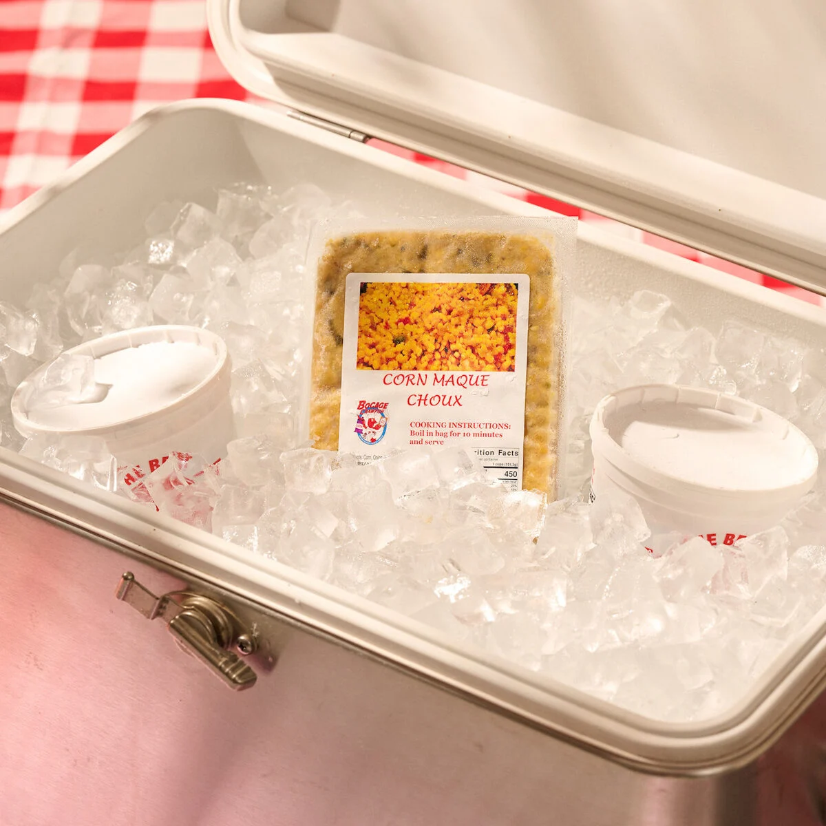 This delicious Corn Maque Choux is packaged in a boil safe bag. It is fully cooked, just needs to be defrosted and heated up. Ingredients: corn, onions, bell peppers, mushrooms and is lightly seasoned.